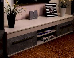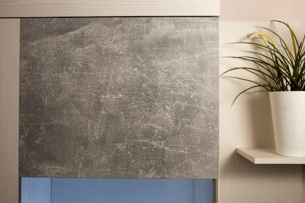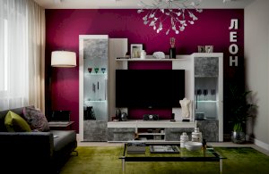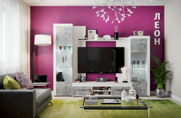 Брутальная эстетика. Законодатели интерьерных тенденций “сдали” бетону кухню, ванную, облицовку стен и пола, а теперь уже и мебель для других комнат. Особенно гармонично материалы “под бетон” выглядят в лофтах - популярных однокомнатных планировках недорогих квартир, ориентированных на молодую аудиторию. Спокойный и мужественный “бетонный” декор Ателье Светлый на фасадах стенки ЛЕОН облечен в раму из древесного декора Ясень Анкор светлый.