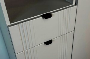 Дизайн комода продуман до мелочей: с одной стороны расположена глухая дверца, за которой скрывается просторное пространство для хранения. С другой стороны – ниша с открытой полкой, выкатной ящик и ещё одна глухая дверца, что позволяет гибко организовать хранение и поддерживать порядок в доме.